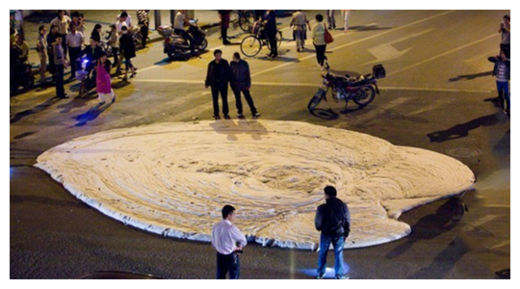 Một chất rất lạ đã chảy tràn trên đường phố của thành phố Nam Kinh, Trung Quốc tối thứ 7 ngày 11/5/2013. Thông thường, tại các nước Châu Á khi một chất lạ lùng bắt đầu phun lên mặt đất thì nó được liên tưởng như là một cuộc xâm chiếm của quái vật khổng lồ trong các bộ phim hạng B, nhưng lần này, sự xâm lược có vẻ thật hơn, có mùi vị hơn.