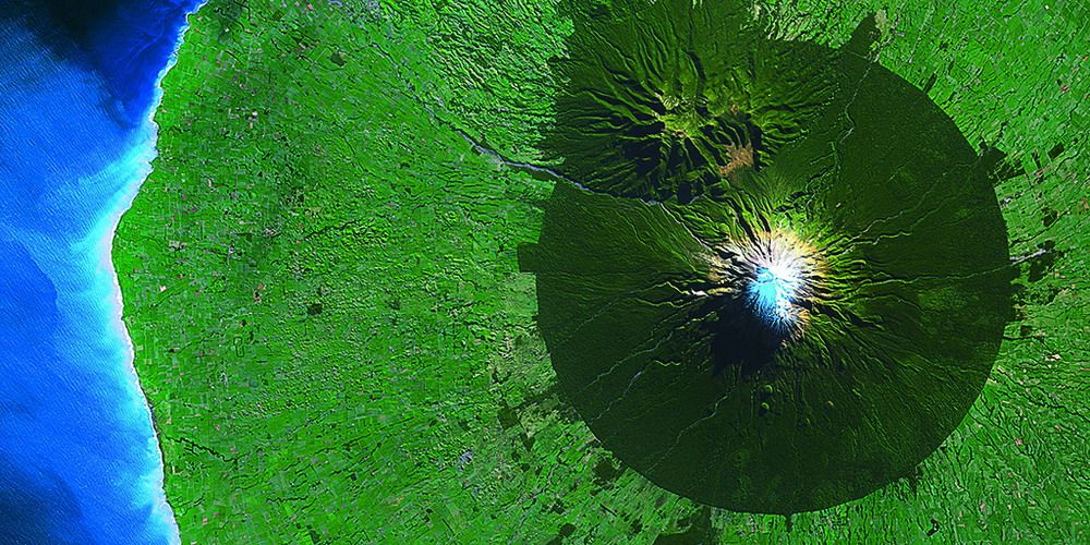 Núi lửa Taranaki, New Zealand: Một hình ảnh rất rõ nét về các khu vực khác nhau của núi lửa Taranaki thuộc công viên quốc gia Egmont. Chúng ta có thể thấy rõ miệng núi, sườn núi lửa và các khu vực xung quanh. Vòng tròn này có bán kính 9,6km, với chiều cao núi lửa là 2518 mét và đã không hoạt động kể từ năm 1755.
