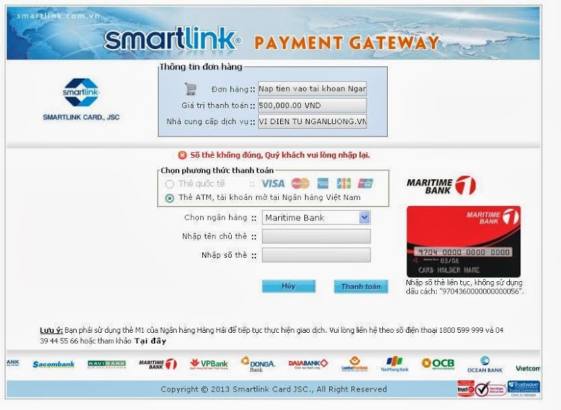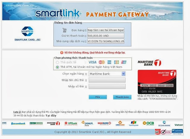 Ví dụ: mua thẻ điện thoại online, khi tới phần thanh toán, bạn chọn thanh toán qua thẻ nội địa (ATM), chọn Ngân Hàng Maritime (Ngân hàng tôi đang sử dụng), sẽ ra bảng bên dưới: