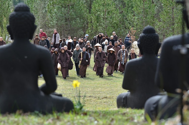 Thoạt đầu, thấy cái gì đó như đơn giản, như công thức, như “trại hè thanh thiếu niên”! Rồi, chỉ sau 5, 7 ngày, ta ngỡ ngàng nghe lời tâm sự của những thiền sinh có đời sống thật khó khăn thấy sự thay đổi xảy ra trong lòng họ. Một chị người Pháp gốc Việt hôm mới đến vừa khóc vừa hỏi: “Thầy dạy hãy nghĩ rằng mình không đi một mình, lúc nào cũng có ông bà, cha mẹ mình đang cùng đi trong từng bước… Nhưng con KHÔNG MUỐN họ đi cùng với con, con hận họ!”. Mấy hôm sau, giữa đêm hội Vu Lan, chị đột ngột chạy ra bàn điện thoại, gọi về nhà. Ông bố sững sờ. Đã bao nhiêu năm ông không chờ đợi cú điện thoại của cô con gái bỏ nhà ra đi! Những chuyện “người thực việc thực” như thế ở LM có nhiều lắm. Chỉ cần dẫn một con số: sau khóa tu 5 ngày của 800 người Hòa Lan ở EIAB, có 200 người xin quy y, trong đó có nhiều tín đồ Công giáo, Do Thái giáo. Họ quy y vì thấy đạo Bụt mà Thay dẫn dắt họ vào là con đường hạnh phúc.